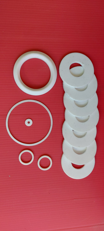 واشر تفلون خالص(P.T.F.E) دارای تحمل حرارت تا ۲۶۰ درجه غیر مستقیم میباشد و از ویژگی های آن میتوان بهداشتی بودن غیر سمی، مقاوم دربرابر چسبندگی،عایق الکتریسیته و مقاوم در برابر حلال ها و عوامل شیمیایی نام برد.